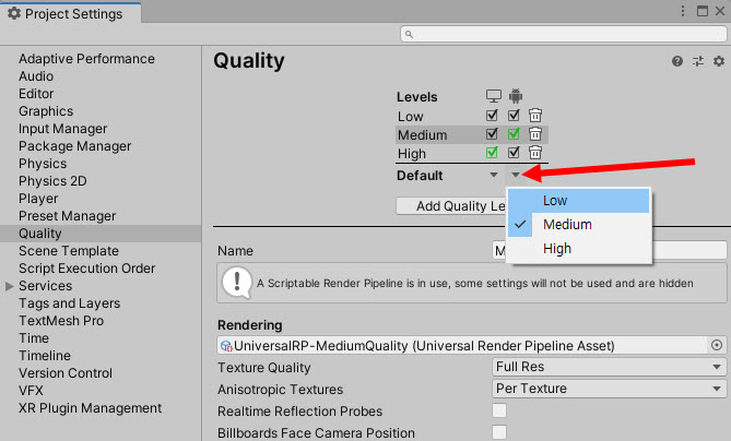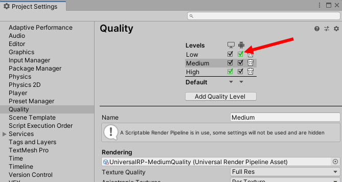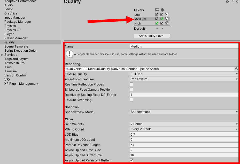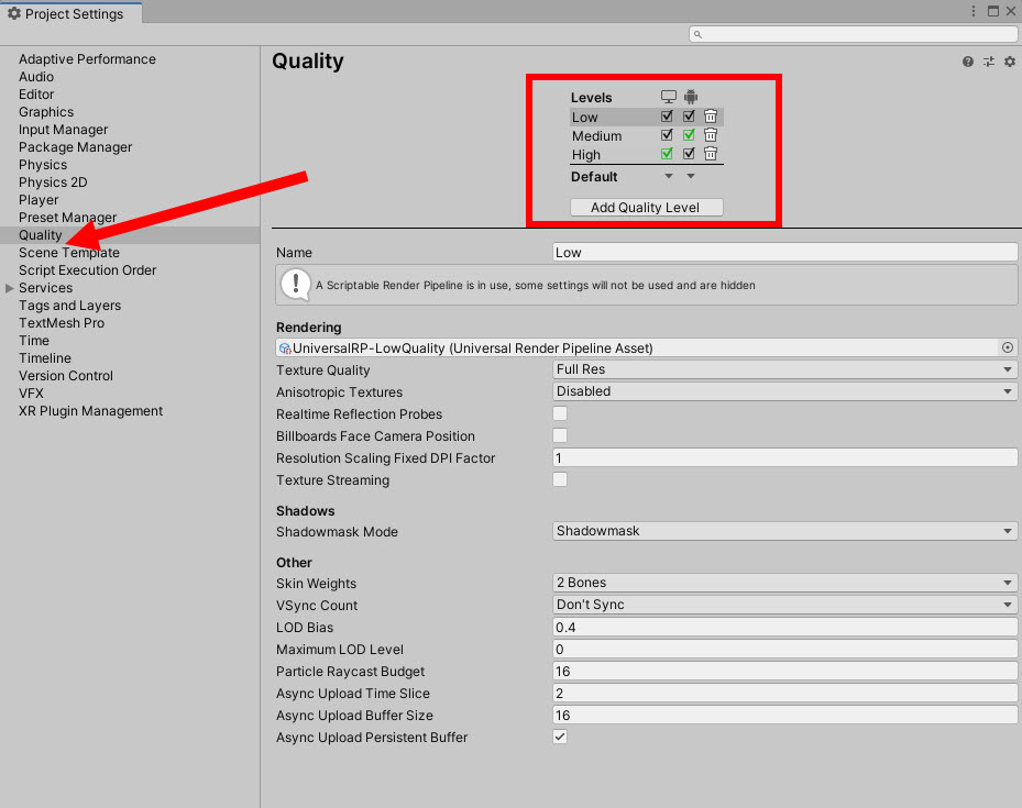 1)프로젝트의 각 플랫폼에 대한 그래픽 품질 수준을 설정하려면 project settings의 quality로 이동한다.