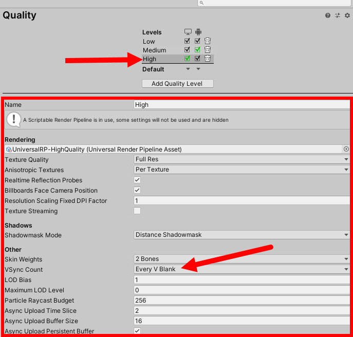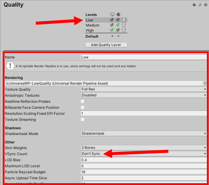 레벨이 높으면(high) 그래픽 품질이 높아지지만 프레임속도를 희생한다. 예를들어 high 레벨과 다르게 low 레벨은 기본적으로 vsync를 사용하지않음으로 설정되어있다(vsync count- dont sync)