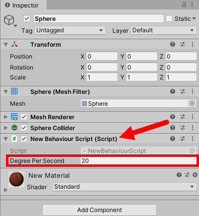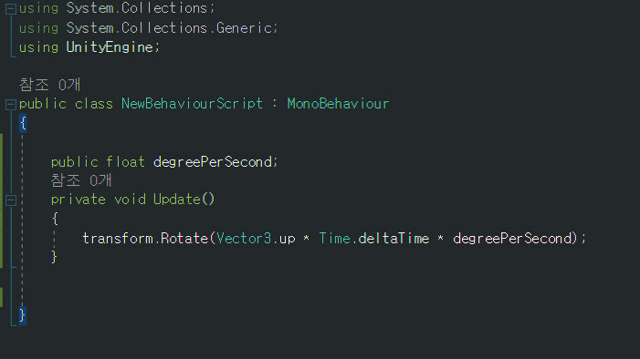 4)스피어 오브젝트에 스크립트를 추가하고 degreePerSecond 수치를 입력한후 게임을 플레이하면 오브젝트가 회전하는것을 확인할수있다.