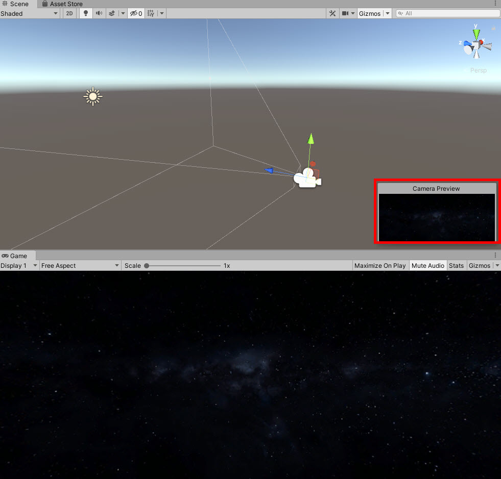 10)씬의 camera preview 또는 game view에서 개별 카메라 오브젝트의 스카이박스 배경이 설정된것을 확인할수있다.