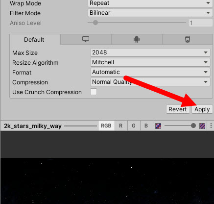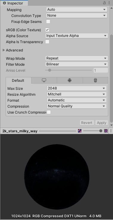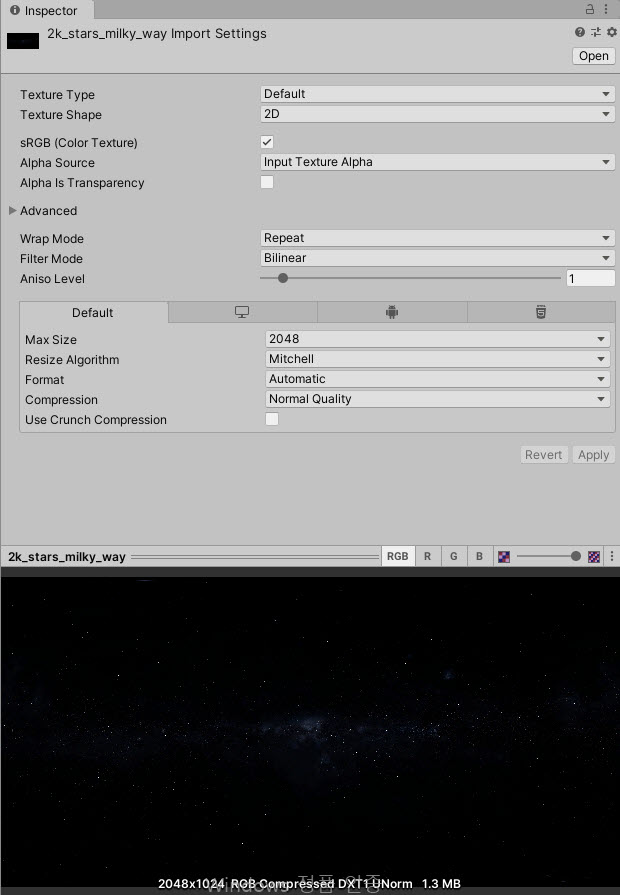 1)유니티에서 스카이박스의 배경으로 설정한 텍스처를 가져오기한다(import)