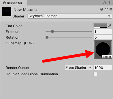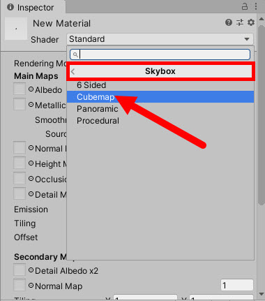 4)새로운 재질을 생성한다. 재질의 쉐이더로 skybox의 cubemap를 선택한다.