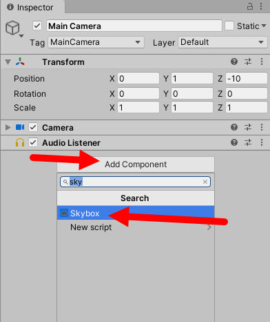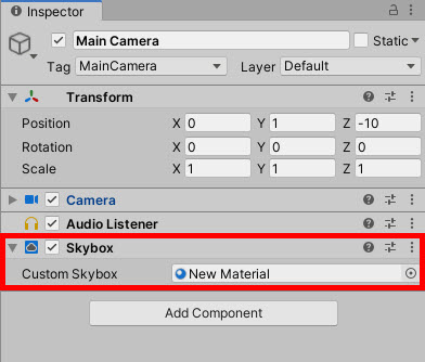 8)카메라 오브젝트에 skybox 컴포넌트를 추가한다.