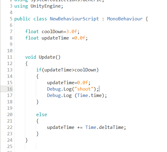 시간이 되면(if(updateTime>coolDown)) 행위를 일으키고 updateTime를 초기화한다. updateTime의 업데이트는 시간의 흐름을 의미한다 (updateTime += Time.deltaTime;)