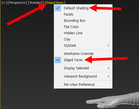 10)기본 쉐이딩인 default shading에 체크되어있는지 확인한다. edged faces에 체크하면 모델의 기본 쉐이딩에 추가적으로 엣지 와이어프레임을 표시한다(단축키 f4)