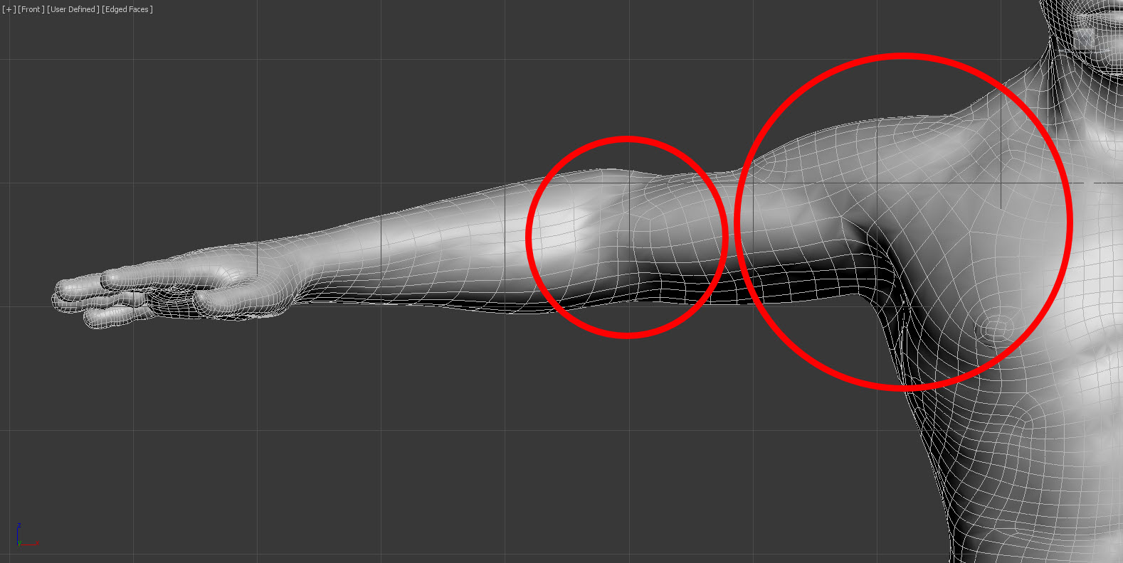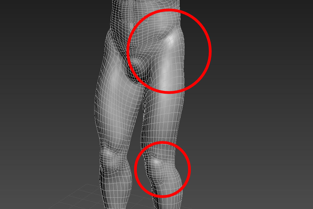 11)캐릭터가 올바르게 모델링되었는지 특히 관절(joint)의 위치가 적합한지 확인한다. deformation(변형)이 특별히 중요한 부분인 joint(관절) 부위가 사각형 폴리곤(quad)으로 이루어져있는지 확인한다.