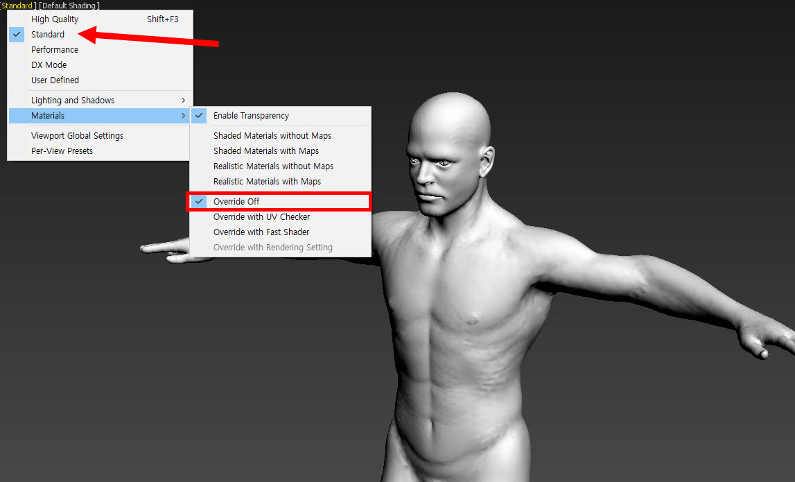 9)standard를 선택하고 materials의 override off에 체크하면 뷰포트에서 모델을 기본 재질로 표시한다.
