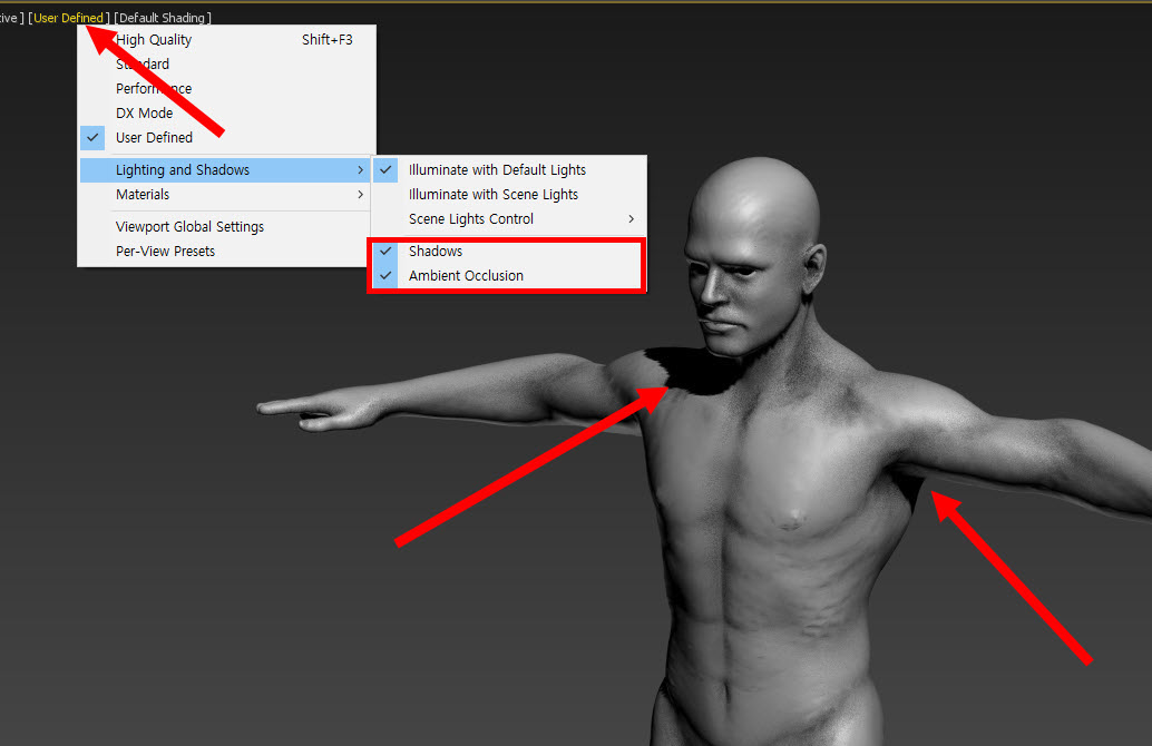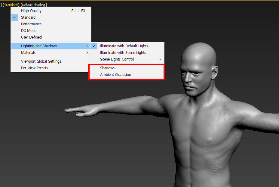 7)뷰포트의 shadows와 ambient occlusion이 활성화되있는것을 확인할수있다.