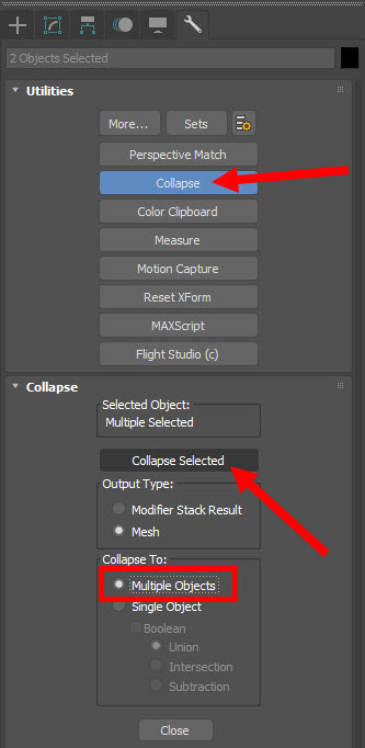 9)utilities의 collapse를 선택하고 collpase selected를 클릭한다(선택한 오브젝트가 2개이상일 경우 multiple objects에 체크한다)