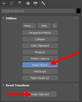 7)utilities의 reset XForm을 선택하고 reset selected를 클릭한다.