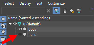 3)특정 오브젝트를 씬에서 비활성화하려면 레이어에서 아래 표시한 아이콘을 클릭한다.