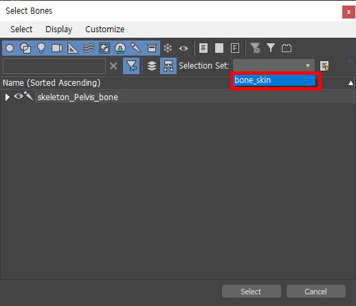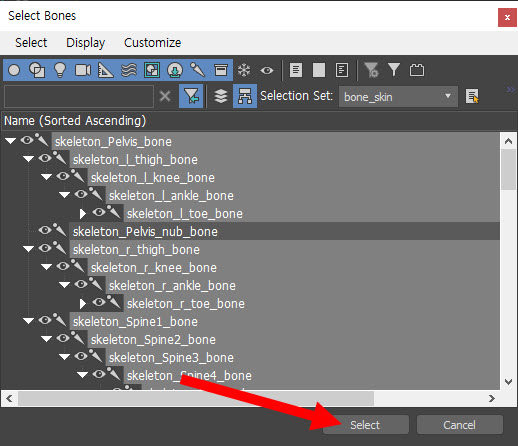 10)selection set에 해당하는 모든 본 오브젝트가 선택된것을 확인할수있다. select를 클릭하면 선택항목을 추가한다.