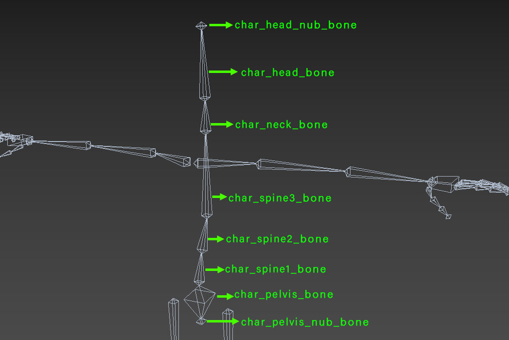 2)척추를 구성하는 본 오브젝트에 대해서 spine와 neck의 순번을 설정한다. 본 사슬의 끝에 존재하는 end bone에 대하여 _nub을 추가한다