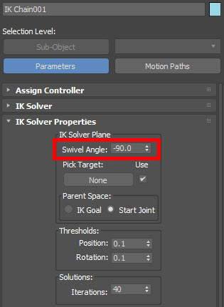 10)motion 패널에서 IK solver 속성의 swivel angle에 값 90을 입력한다.