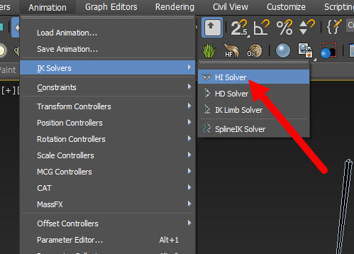 2)상단의 animation 메뉴에서 IK solvers의 HI solver를 선택한다.