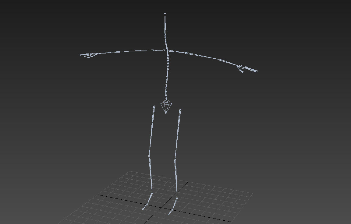 1)예에서 씬에 본(bone) 오브젝트로 구성된 스켈리톤(skeleton)이 존재하는것을 확인할수있다.