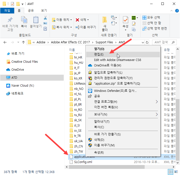2)AMT폴더에서 application.xml 파일을 선택하고, 마우스 우클릭한후에 편집으로 이동합니다.