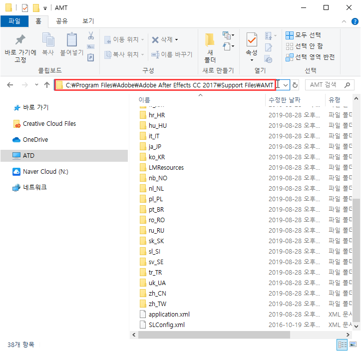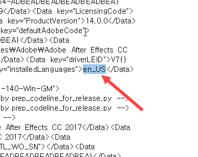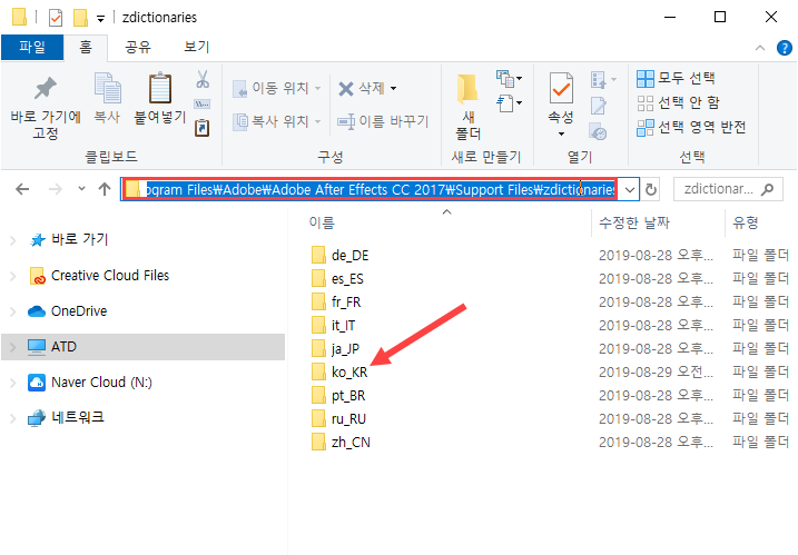 9)ko_KR 폴더에 존재하는 파일의 이름(after_effects_ko_KR)을 변경합니다.