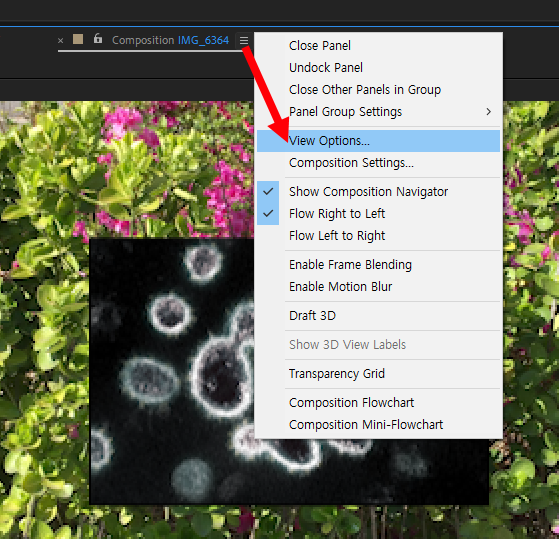2)컴포지션(composition) 패널에서 아래 표시한곳(컴포지션 이름 우측)을 클릭하고 view options으로 이동합니다.