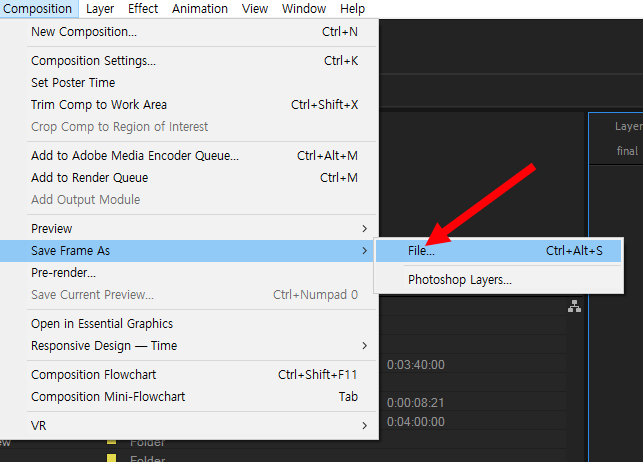1)상단의 composition 메뉴에서 save frame as의 file로 이동합니다.