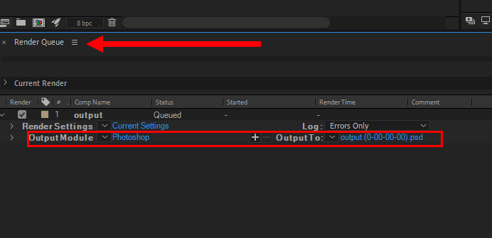 2)render queue에 psd형식의 아웃풋 항목이 추가된것을 확인할수있습니다.