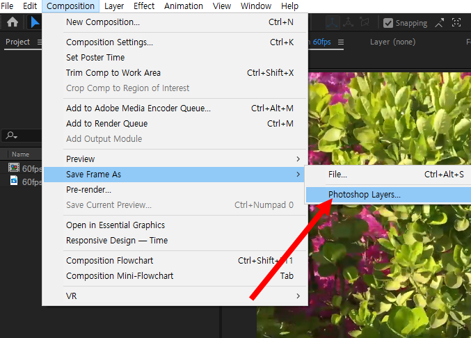 3)상단의 composition 메뉴에서 save frame as의 photoshop layers를 선택합니다.