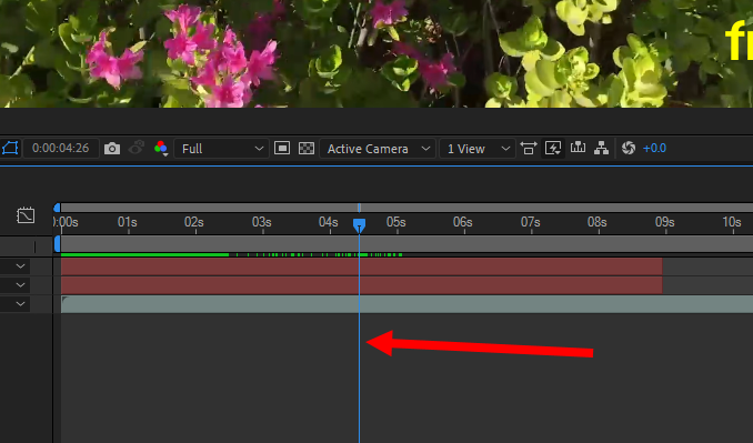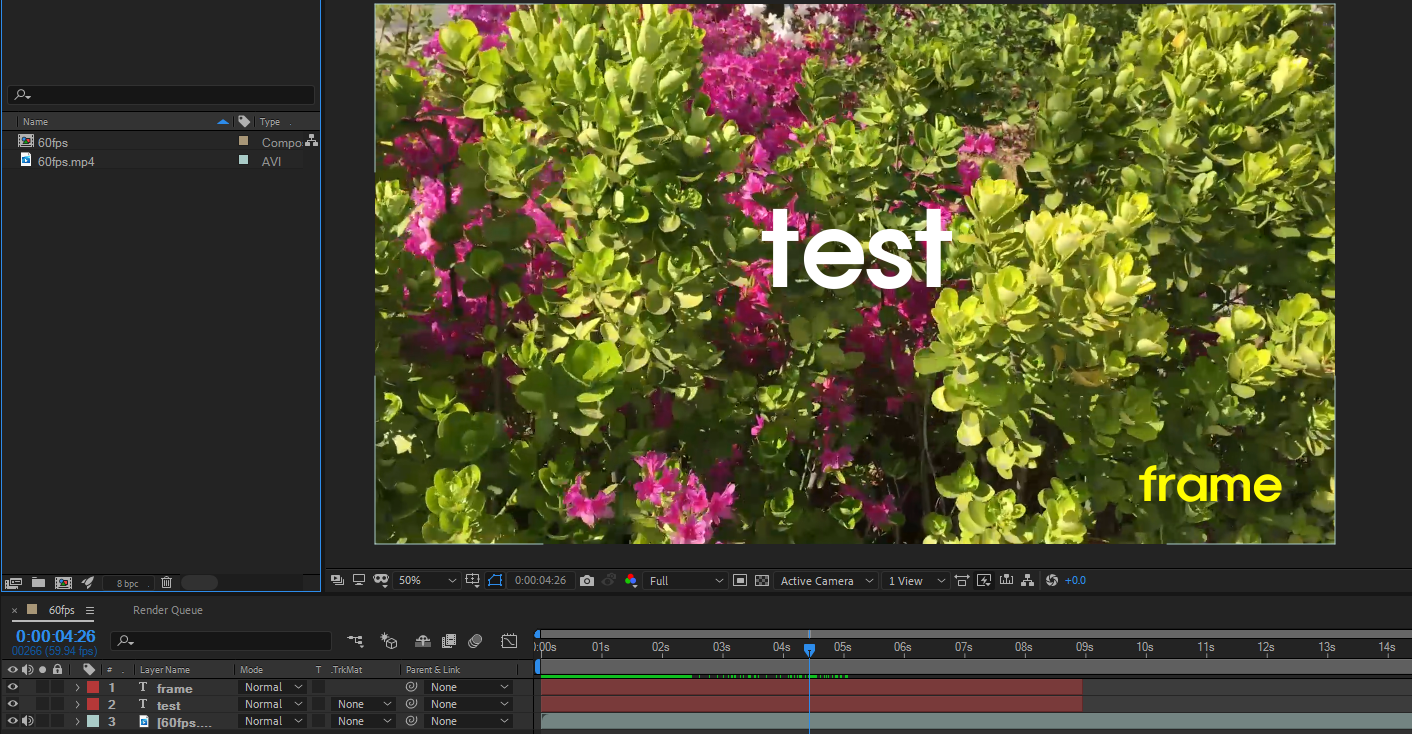 1)예에서 동영상 및 텍스트 레이어로 컴포지션을 구성하였습니다.