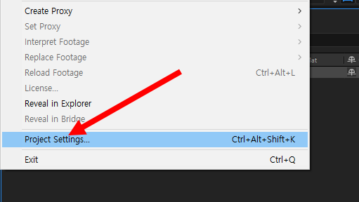 2)시간 표시방법을 프레임(frame)으로 변경하려면 상단의 file 메뉴에서 project settings로 이동합니다.