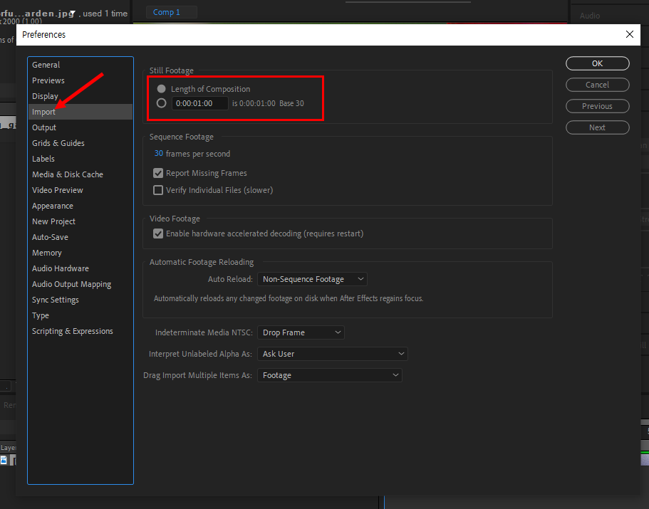 2)preferences의 import에서 still footage의 length of composition에 체크되어있는것을 확인할수있습니다.