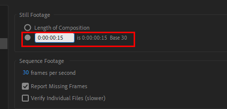 2)preferences의 import에서 still footage의 length of composition에 체크되어있는것을 확인할수있습니다.