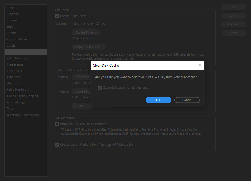 에프터이펙트(after effect)에서 디스크 캐시 삭제하기