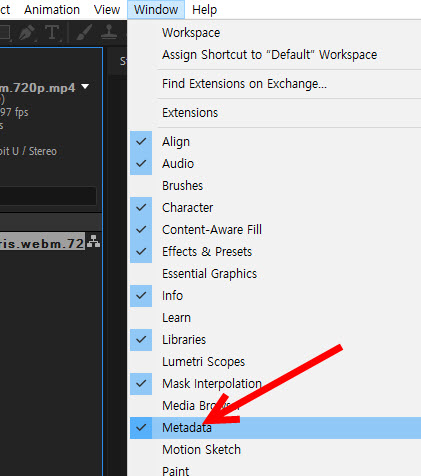 2)동영상의 메타데이터를 확인하려면 상단의 window 메뉴에서 metadata로 이동합니다.