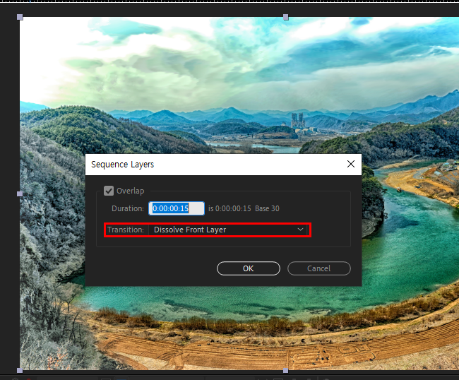 4)overlap에 체크하고 duration을 입력합니다. duration은 두 레이어가 겹치는 시간을 의미합니다.