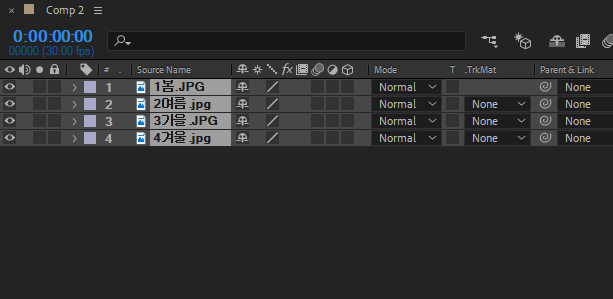 1)시퀀스 레이어에 사용할 모든 레이어를 컴포지션에 추가합니다.