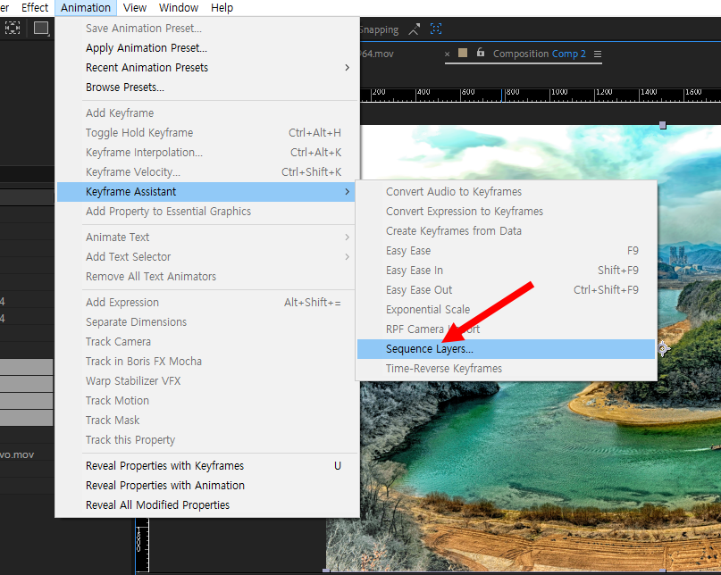 3)상단의 animation 메뉴에서 keyframe assistant의 sequence layers를 선택합니다.