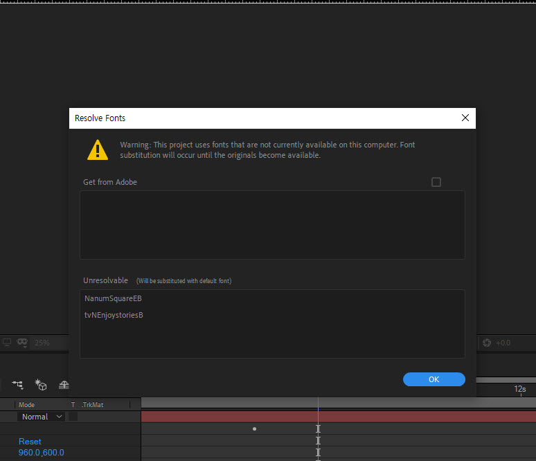 1)에프터이펙트에서 프로젝트를 실행할때 폰트 또는 이미지 등 소스 파일이 누락된경우 대화상자에서 표시합니다.