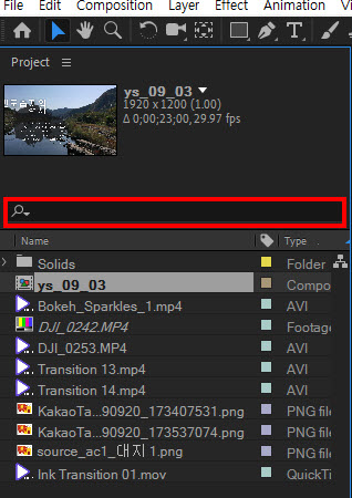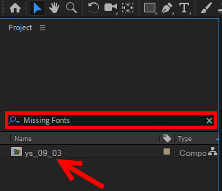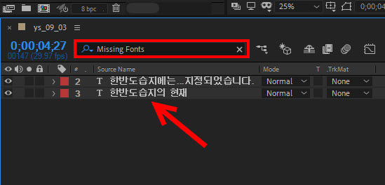 5)예에서 missing fonts를 검색하여 검색결과에 누락된 폰트를 사용중인 컴포지션이 표시되는것을 확인할수있습니다.