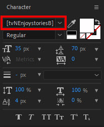 6)컴포지션을 선택하면 해당 폰트를 사용중인 텍스트 레이어를 확인할수있고 character 패널에서 누락된 폰트를 대괄호로 표시합니다.