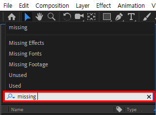 3)누락된 이펙트(missing effects), 폰트(missing fonts), 푸티지(missing footage), 미사용(unused) 등의 키워드가 표시되며 선택하면 해당 항목을 검색합니다.