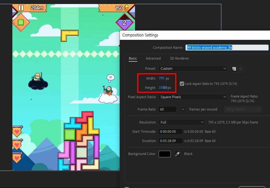 4)컴포지션의 해상도를 확인하면 사이즈가 변경된것을 확인할수있다.