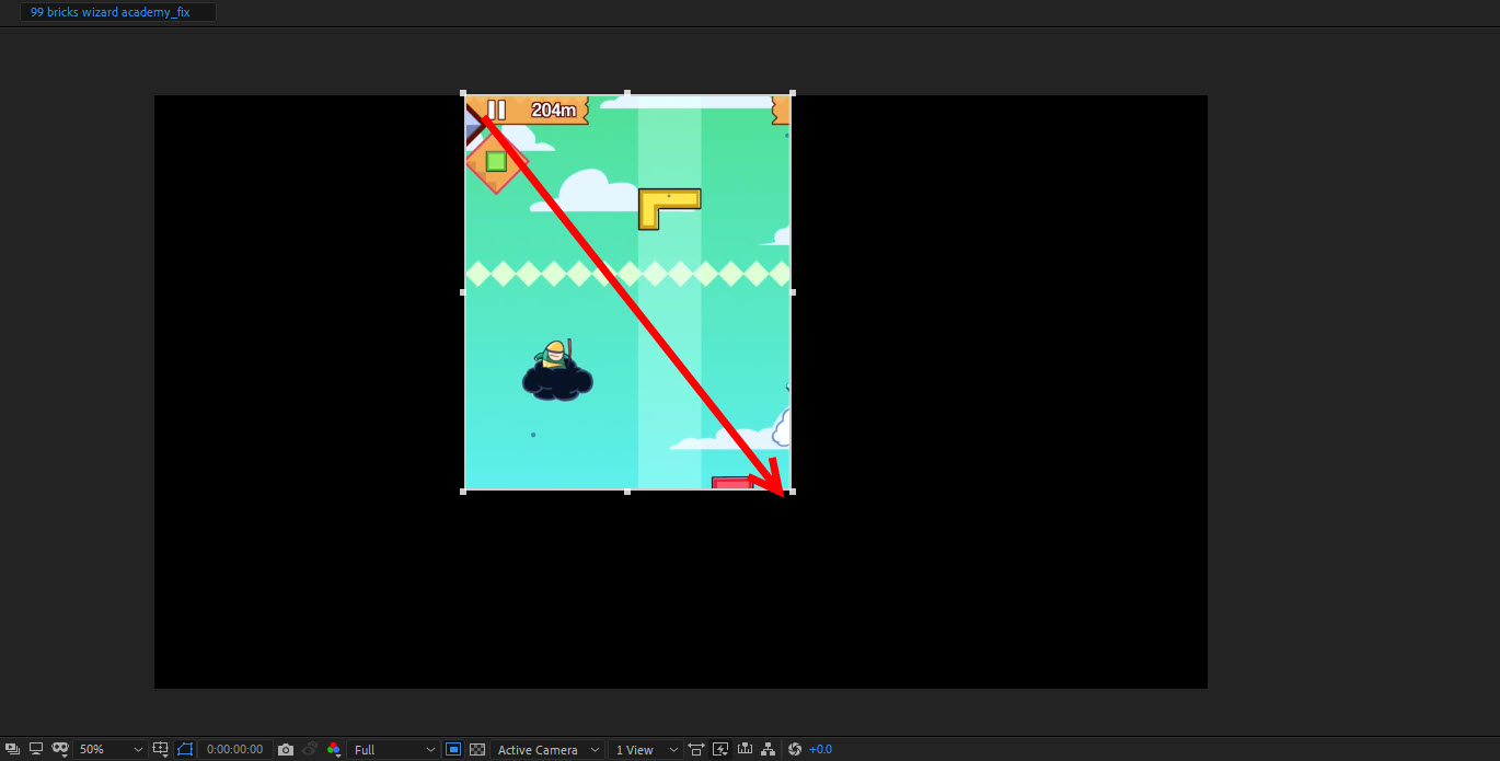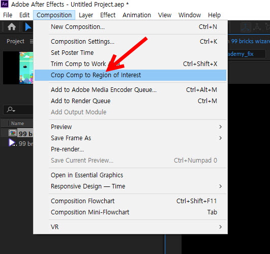 3)상단의 composition 메뉴에서 crop comp to region of interest를 클릭하면 현재 선택된 영역을 남깁니다.