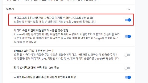 크롬(chrome) 브라우저에서 파일 다운로드 차단 해제하기 1)크롬 브라우저는 기본적으로 유해하다고 판단한 다운로드 파일을 자동으로 차단한다. 2)만약 사용자가 일시적으로 이것을 해제하기를 원하는 경우크롬 브라우저의 설정으로 이동한다. 3)개인정보 및 보안에서 세이프 브라우징을 비활성화하면 크롬은 의심스러운 다운로드 파일을 차단하지않는다. 4)특별한 경우 일시적으로 사용하고 다시 세이프 브라우징을 활성화하는것을 권장한다.