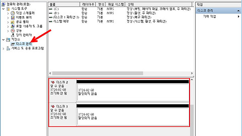 컴퓨터에 내장하드 드라이브 추가 및 설치1)새로 구매한 내장하드를 컴퓨터에 장착 및 연결하면 컴퓨터 관리에서 추가된 하드 디스크를 확인할수있다. 아래 이미지에서 새로 추가한 두 개의 디스크를 표시하고있다. 2)새로 추가한 하드 디스크의 초기화를 진행한다. 아래 대화상자는 새로 추가한 디스크에 대해서 자동으로 팝업된다. MBR 또는 GPT 파티션 형식을 선택하고 확인한다. 3)위에서 디스크 초기화를 진행한후에 마우스 우클릭, 새 단순 볼륨을 선택한다.4)디스크의 볼륨을 구성하는 단계이다. 5)최대 디스크 공간보다 작거나 같은 크기의 볼륨을 설정한다. 6)드라이브에 할당할 문자를 선택하고 다음으로 넘어간다.7)파일 시스템으로 NTFS를 선택하고 빠른 포맷에 체크한후 다음으로 넘어간다.8)위에서 설정한 항목을..