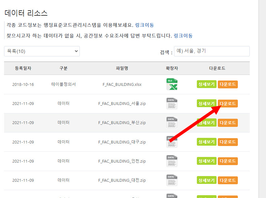 2)데이터셋 검색에서 '건물통합정보'를 입력한다.