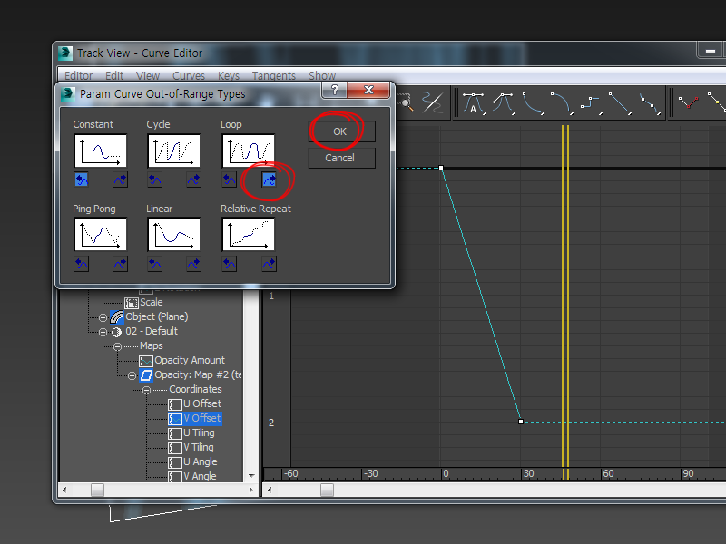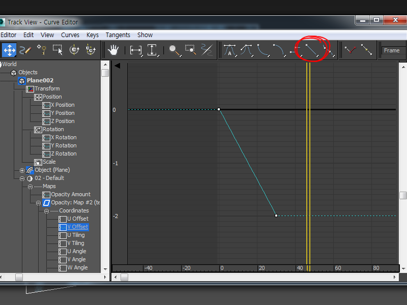 10)오브젝트를 선택하고 Track view - Curve Editor의 좌측에서 V Offset 속성을 선택하여 애니메이션 커브를 표시합니다.
