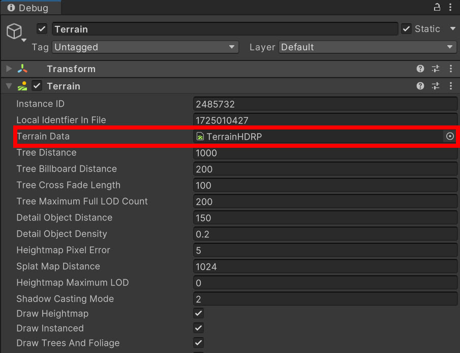 4)터레인 오브젝트를 선택하고 인스펙터(Inspector)에서 디버그 모드로(Debug) 변경합니다.